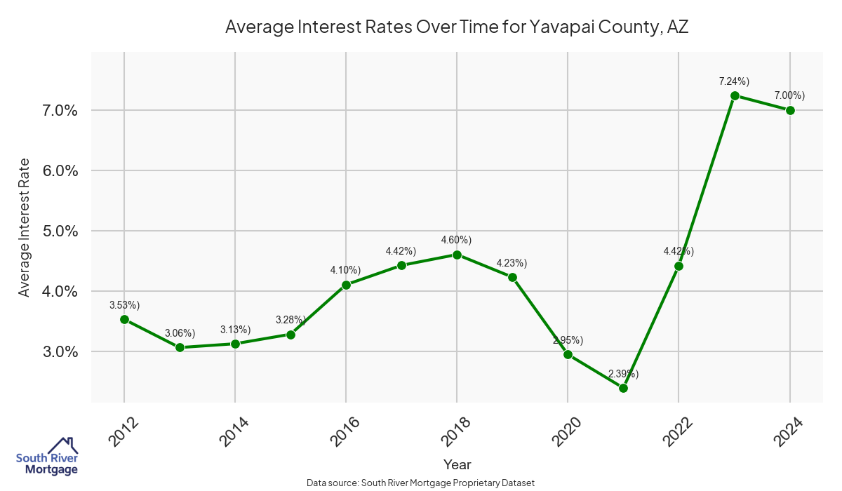 There are approximately 1567 active reverse mortgage loans in Yavapai County. The average interest rate in Yavapai County is 7.42% for reverse mortgages. The average maximum claim amount (the lesser of the appraisal or lending limit), among reverse mortgage borrowers, in Yavapai County was $567,510.64 in 2024.