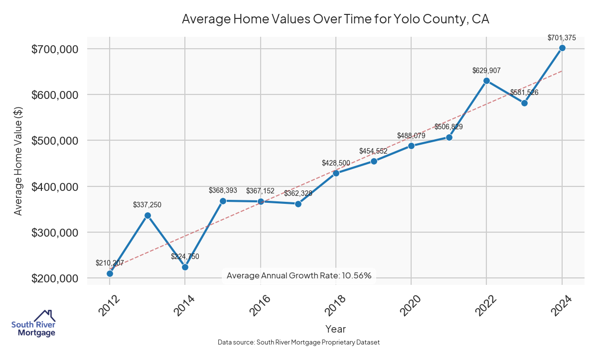 In 2024, there were 198 active reverse mortgage loans in Yolo County, California. The average home value in Yolo County is $584,908.88.