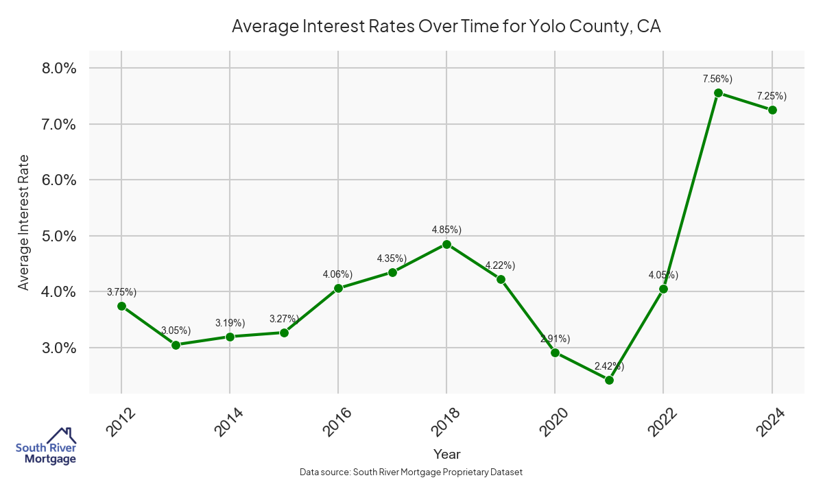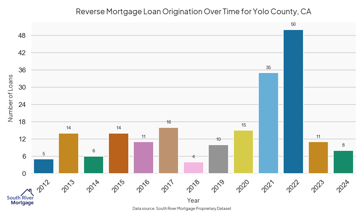 There are approximately 198 active reverse mortgage loans in Yolo County. The average interest rate in Yolo County is 7.54% for reverse mortgages. The average maximum claim amount (the lesser of the appraisal or lending limit), among reverse mortgage borrowers, in Yolo County was $557,222.22 in 2024.