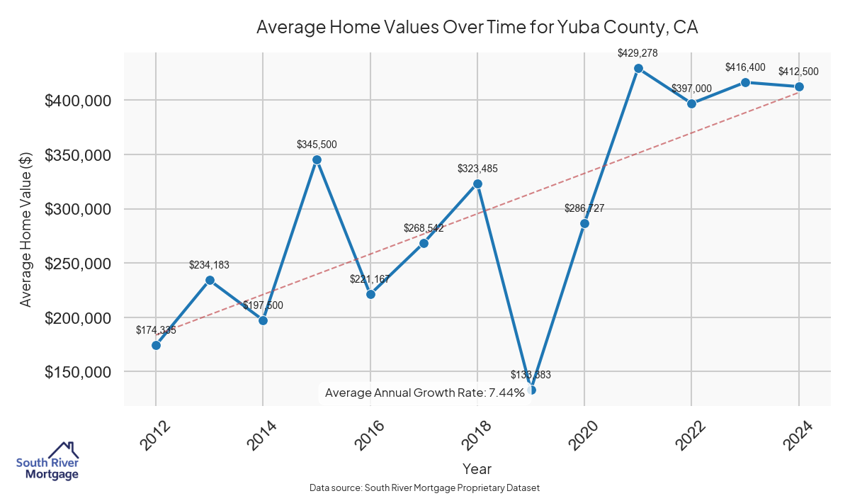 In 2024, there were 106 active reverse mortgage loans in Yuba County, California. The average home value in Yuba County is $406,454.14.