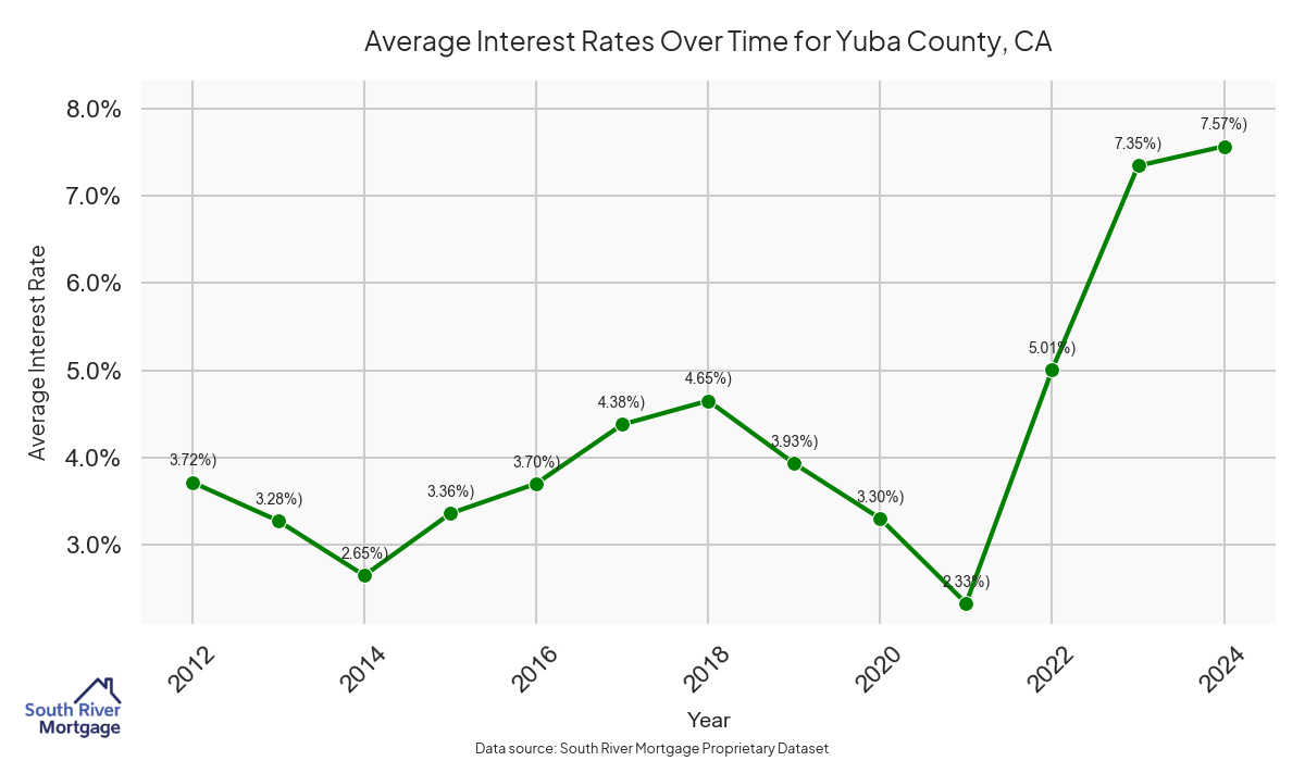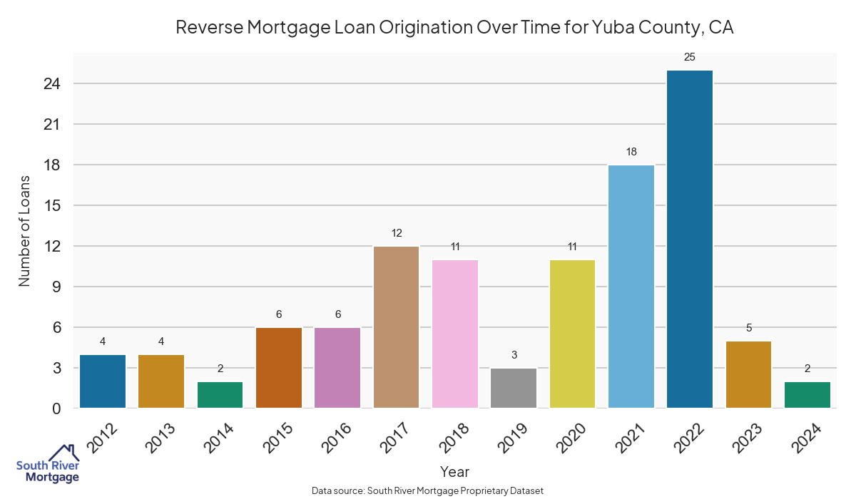 There are approximately 106 active reverse mortgage loans in Yuba County. The average interest rate in Yuba County is 7.24% for reverse mortgages. The average maximum claim amount (the lesser of the appraisal or lending limit), among reverse mortgage borrowers, in Yuba County was $414,166.67 in 2024.
